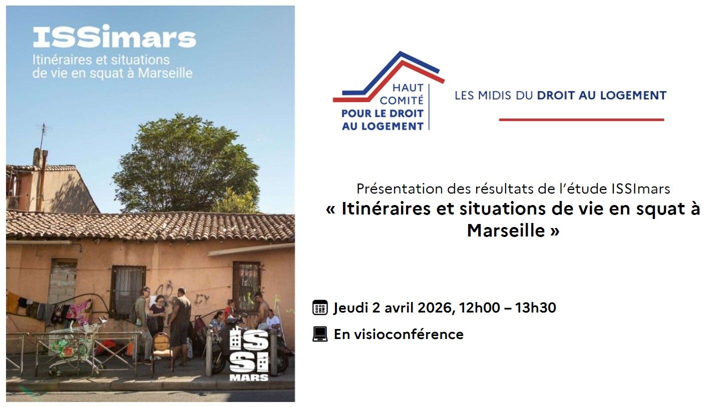 Le Haut Comité pour le Droit au logement a le plaisir de vous inviter à un webinaire consacré à la présentation des résultats de l’étude ISSImars "Itinéraires et situations de vie en squat à Marseille"